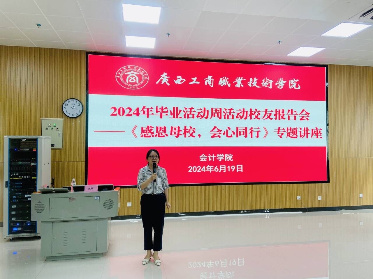 6月19日下午,會(huì)計(jì)學(xué)院2024年畢業(yè)活動(dòng)周活動(dòng)校友報(bào)告會(huì)——《感恩母校,會(huì)心同行》專題講座在A5-102階梯教室舉行。優(yōu)秀校友袁開同志(原2004級(jí)電子商務(wù)專業(yè)畢業(yè)生),現(xiàn)任廣西布道天下信息產(chǎn)業(yè)有限公司創(chuàng)始人兼總經(jīng)理受邀作為主講嘉賓從職場(chǎng)致勝、感恩母校及創(chuàng)業(yè)經(jīng)歷等方面為師生們帶來了一場(chǎng)的精彩講座。會(huì)計(jì)學(xué)院教師以及2022級(jí)全體學(xué)生參加會(huì)議,會(huì)議由會(huì)計(jì)學(xué)院副院長(zhǎng)譚玉娥主持。