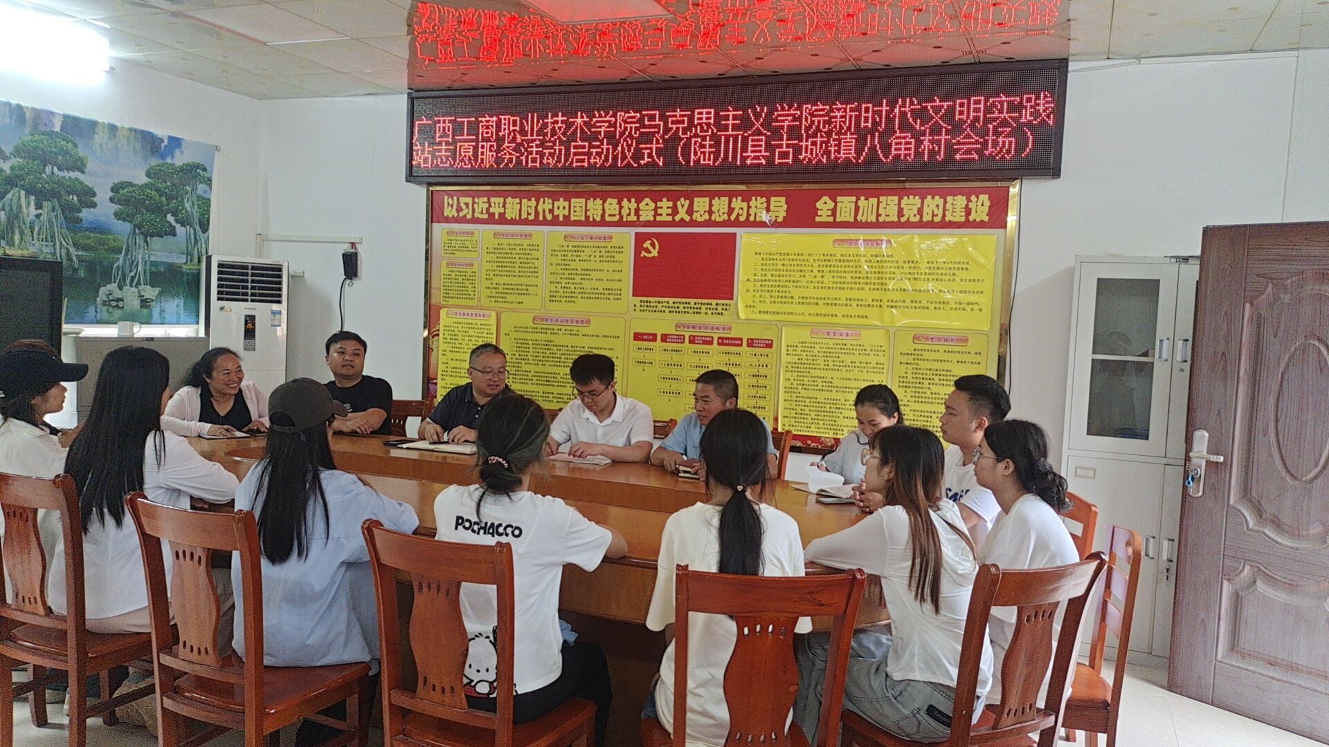 2024年7月8日,“共繪同心圓 鑄牢民族情”社會(huì)實(shí)踐團(tuán)隊(duì)在馬克思主義學(xué)院新時(shí)代文明實(shí)踐站志愿者王開榮和黃士深老師的帶領(lǐng)下前往玉林市陸川縣古城鎮(zhèn)八角村深入開展大學(xué)生暑期“三下鄉(xiāng)”社會(huì)實(shí)踐活動(dòng)。當(dāng)天下午,實(shí)踐團(tuán)隊(duì)在八角村二樓會(huì)議室舉行啟動(dòng)儀式。參加啟動(dòng)儀式的人員有古城鎮(zhèn)副鎮(zhèn)長陶科良、駐村第一書記鐘誠、村支書范善鈞、其他駐村工作隊(duì)員以及10名實(shí)踐團(tuán)隊(duì)師生。啟動(dòng)儀式由鐘誠書記主持。