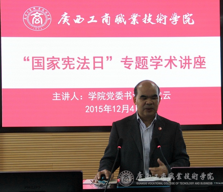 • 2015年12月4日上午,為引導(dǎo)我校學(xué)生弘揚(yáng)法治精神,普及憲法法律知識,學(xué)院黨委書記覃武云在學(xué)院2119會(huì)議室為經(jīng)管系營策1432班和財(cái)信系電商1431班全體同學(xué)作“增強(qiáng)憲法意識,維護(hù)憲法權(quán)威”的專題學(xué)術(shù)講座。社科部...