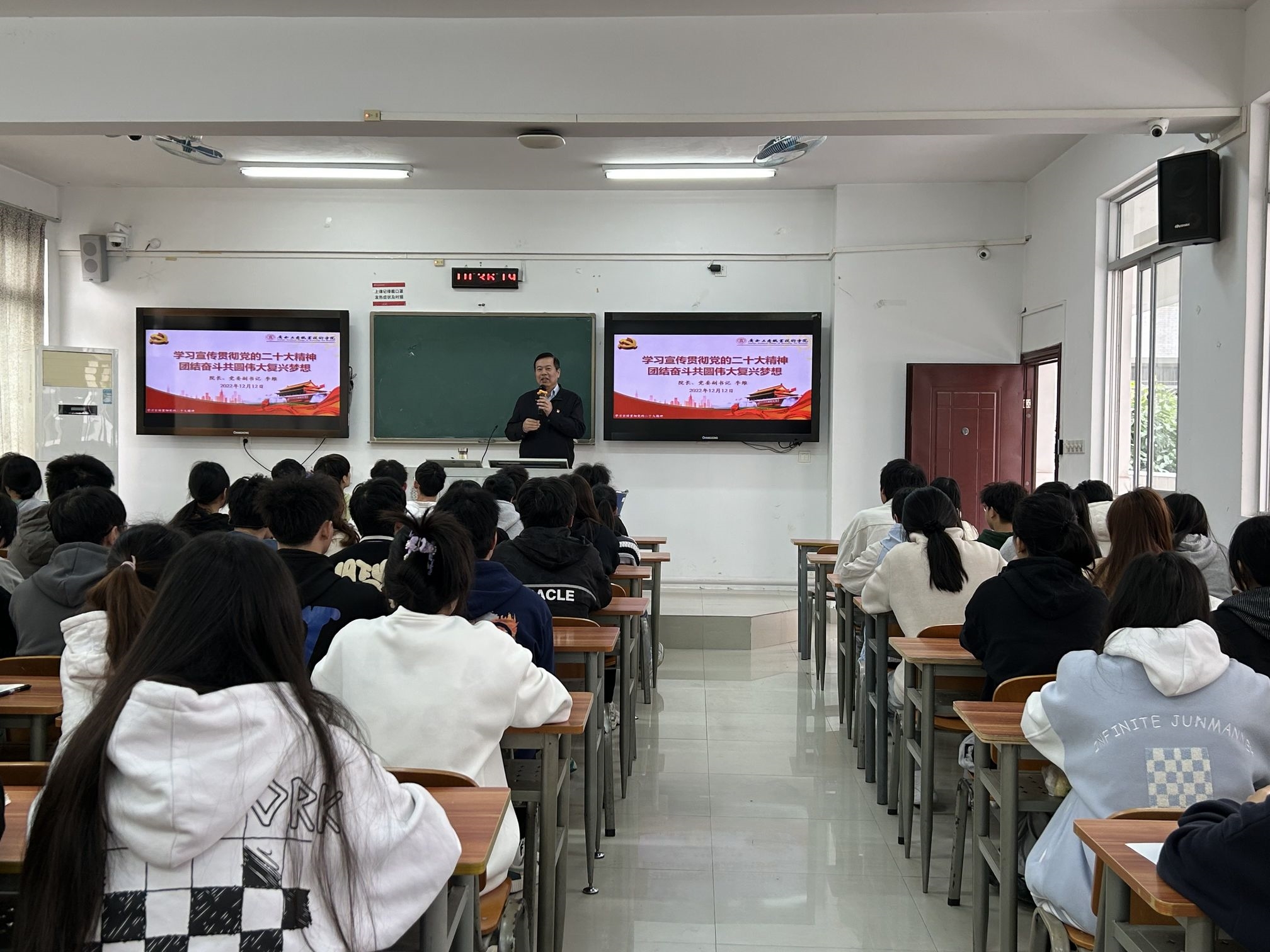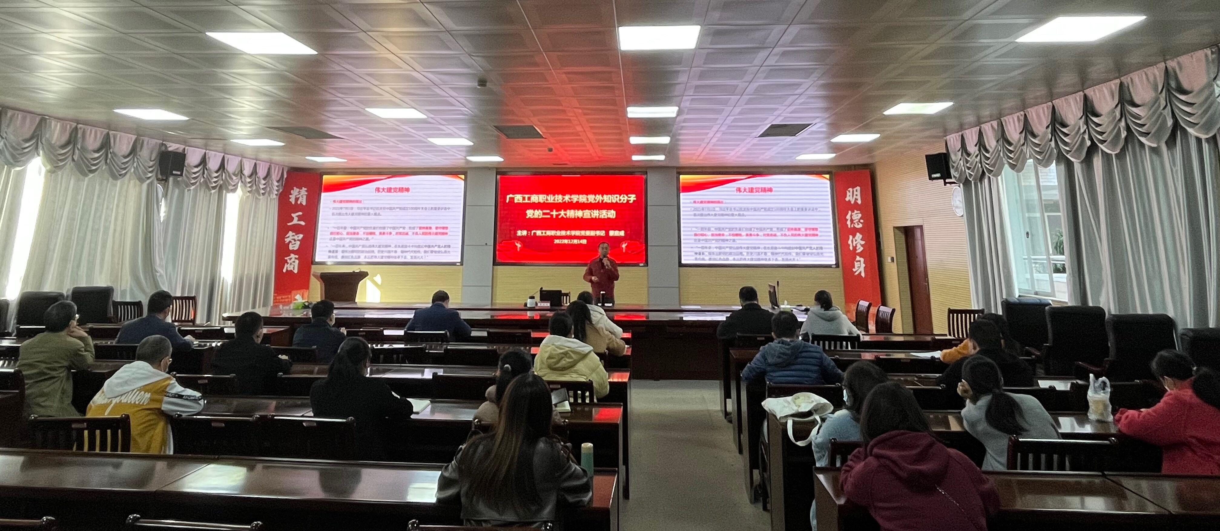 • (會議現(xiàn)場)(學(xué)院黨委副書記蒙啟成作主題宣講)2022年12月14日,我院舉辦專題宣講,面向?qū)W院黨外知識分子宣講黨的二十大精神。學(xué)院黨委副書記蒙啟成作主題宣講。學(xué)院各民主黨派成員、無黨派人士以及黨外知識分...