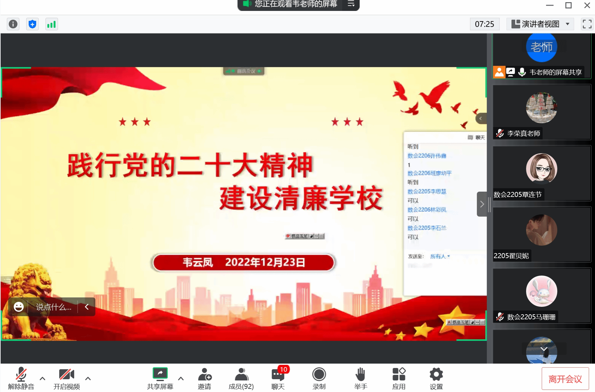 • 2022年12月23日上午,學(xué)院紀(jì)委書記韋云鳳通過云課堂給2022級數(shù)會2205、2206班學(xué)生講授思政課。韋書記以《踐行黨的二十大精神 建設(shè)清廉學(xué)校》為主題展開教學(xué),主要講授了關(guān)于黨的二十大報告的主題、主要成果,關(guān)于...