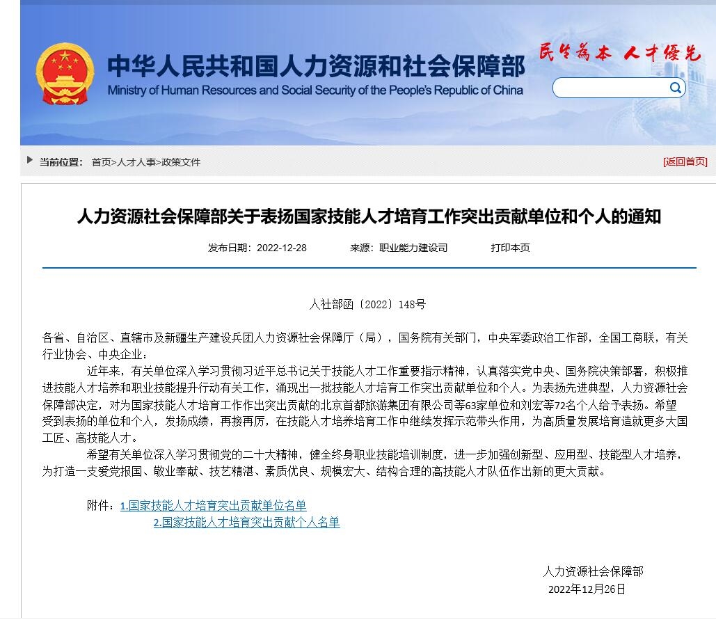 • 2022年12月28日,人力資源和社會保障部發(fā)布《關(guān)于表揚(yáng)國家技能人才培育工作突出貢獻(xiàn)單位和個人的通知》,對為國家技能人才培育工作作出突出貢獻(xiàn)的單位和個人給予表揚(yáng)。我院被評為國家技能人才培育工作突出貢獻(xiàn)單...