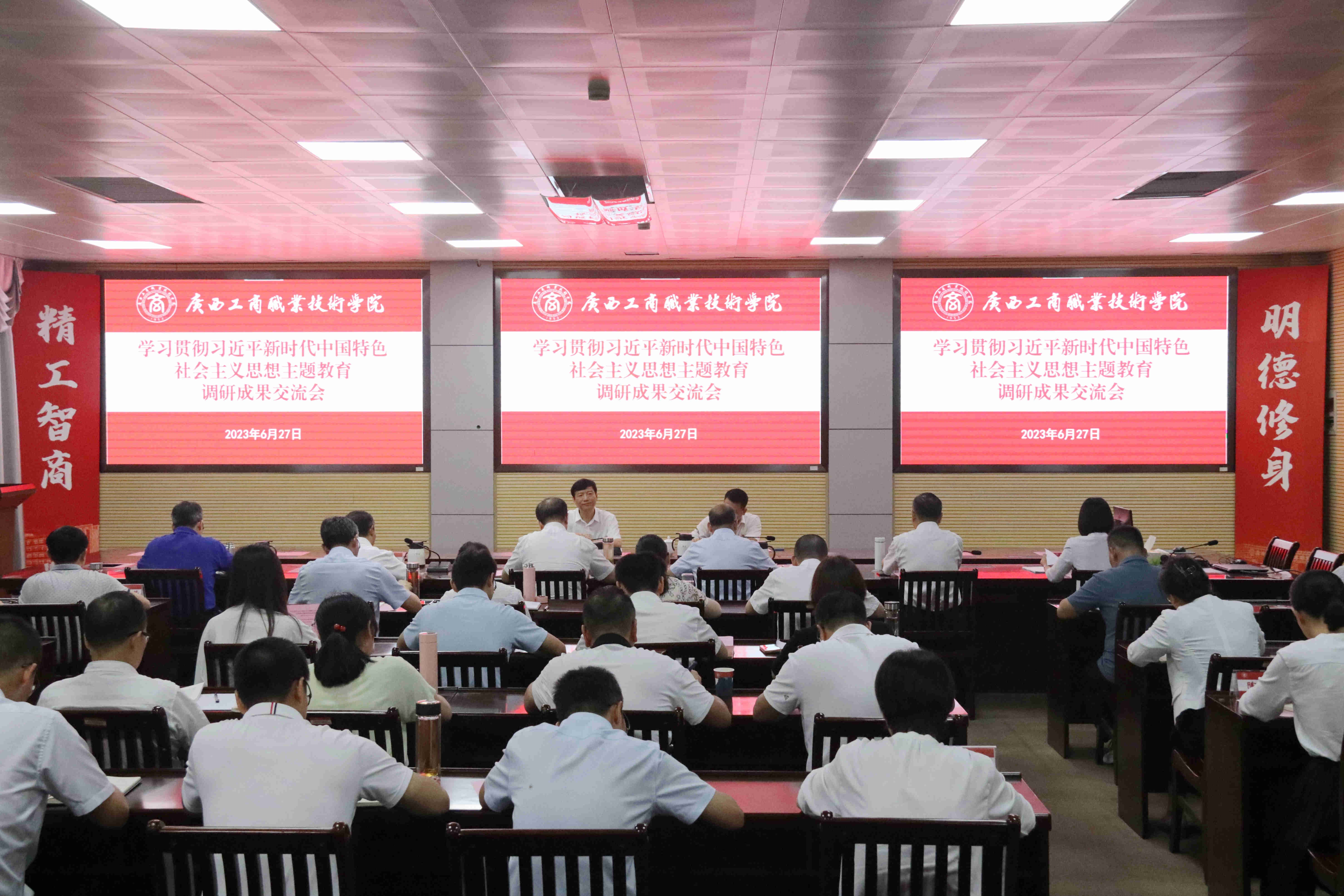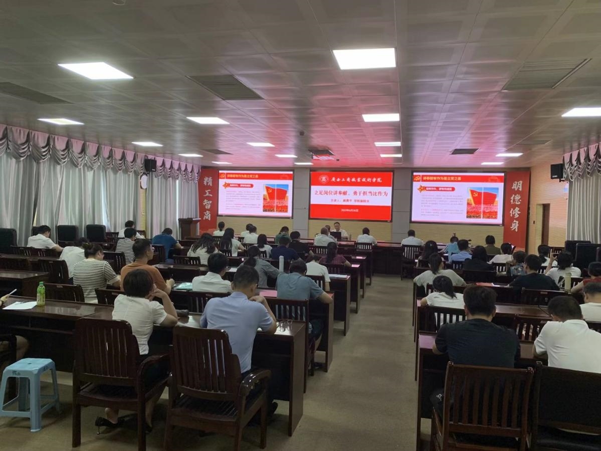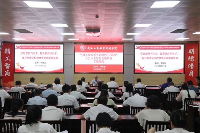 • 為深入開(kāi)展學(xué)習(xí)貫徹習(xí)近平新時(shí)代中國(guó)特色社會(huì)主義思想主題教育,6月27日下午,學(xué)院黨委書(shū)記覃武云以“學(xué)思想擔(dān)當(dāng)作為,促發(fā)展真抓實(shí)干,奮力推動(dòng)學(xué)校教育事業(yè)高質(zhì)量”為題講授專(zhuān)題黨課。自治區(qū)黨委第十二巡回指導(dǎo)...