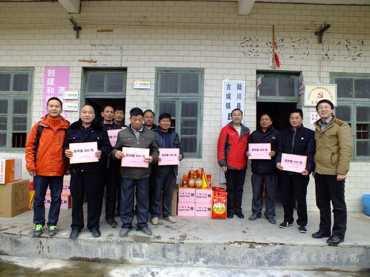 • 春節(jié)前夕,教務(wù)科研處黨支部、學(xué)工處黨支部與陸川縣水亭村黨總支、那若村黨總支、南寧培育圖書有限責(zé)任公司聯(lián)合開展了“扶貧濟(jì)困送溫暖”活動(dòng),為水亭村、那若村9戶貧困戶和1戶困難黨員各送去200元慰問金、一帶大...