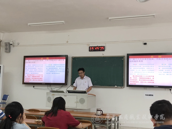 • ?2018年10月8日上午,我院黨委書記覃武云為會計1806、1807班同學開講2018級新生“開學第一課”。會計系黨總支書記林芳、系主任張首楠,思政部副主任陳鳳儉等教師參與了本次聽課。覃書記以“趕考”路上全面從嚴治...